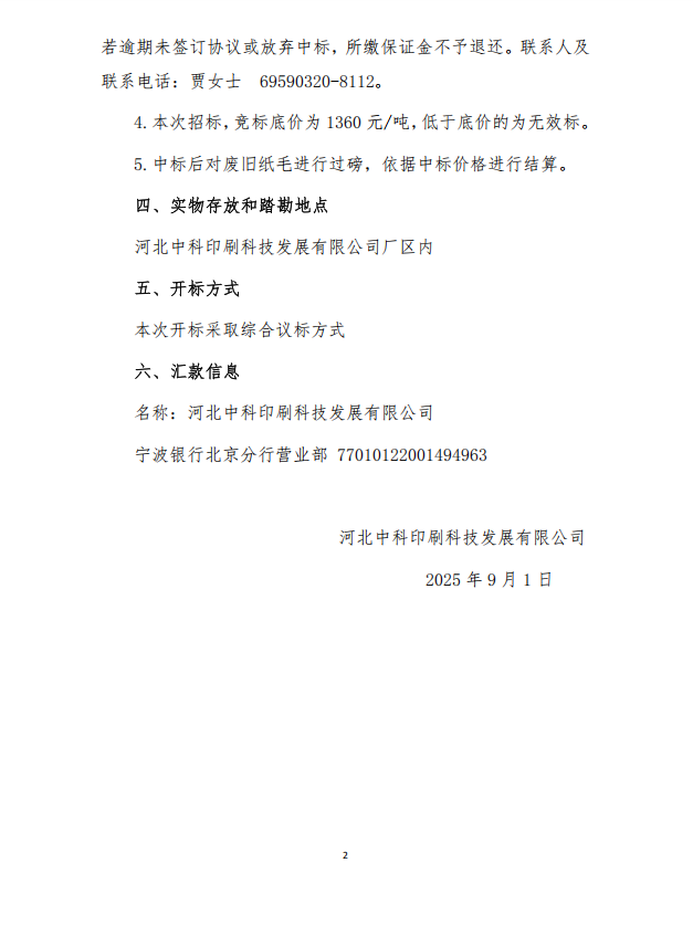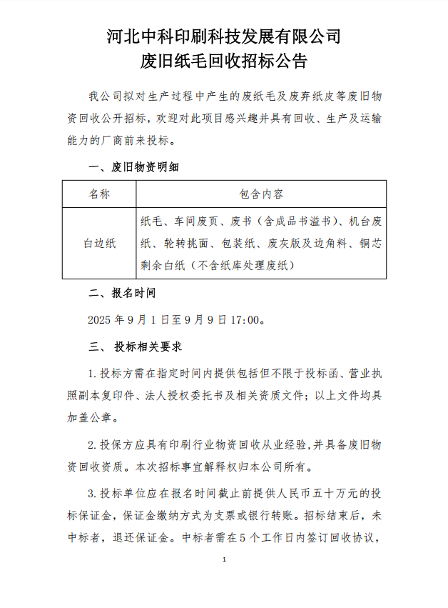 河北中科印刷科技發展有限公司廢舊紙毛回收招標公告