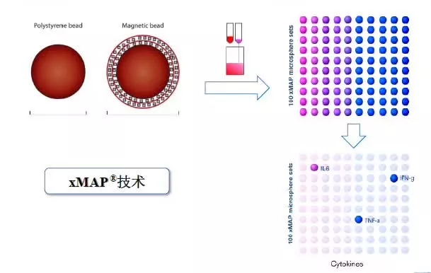 Luminex technology applies the principles of microspheres and flow cytometry. The inside of the microsphere contains two different colors of immunofluorescence, and up to 100 different microspheres can be distinguished by different ratios of fluorescence. Each microsphere can be used to detect a different protein or gene. Therefore, up to 100 proteins can be detected simultaneously using microsphere technology. The technique utilizes a fluorescently encoded microsphere to covalently crosslink a monoclonal antibody, binds to the target molecule to be assayed, adds a fluorescein-labeled detection antibody, and then laser-scans the fluorescent code to identify individual microspheres and measure "detection fluorescence". The intensity determines the concentration of the molecule being tested.