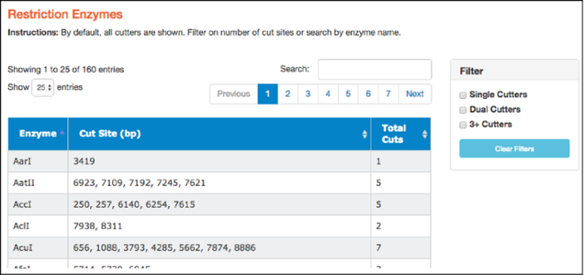 Here you'll find a table of restriction enzymes that cut the given sequence. The table includes enzyme names, the locations where the enzymes will cut (in basepairs), and the total number of times they cut. Use the filters on the right to find single, dual, and 3+ cutters. You can also sort enzymes by clicking on column heads. Clicking on a particular restriction enzyme here also highlights it in the “Map” and “Sequence” tabs.
