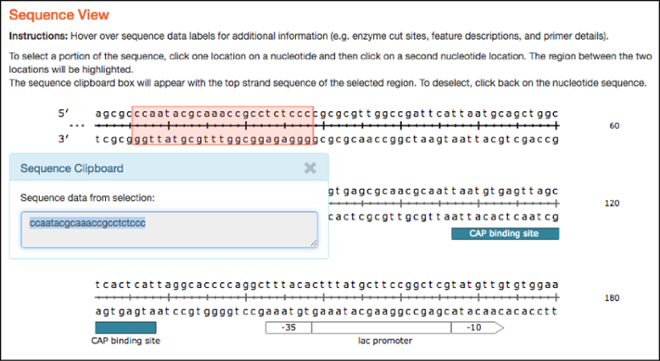 Similar to the plasmid maps, the linear sequences hosted here are now interactive and have similar hover over features. As with the map tab, clicking on two separate locations in the linear sequence selects the sequence between the two locations and sends it to the clipboard for copy and paste functionality.