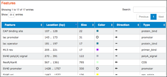 The table found here lists the common features detected in the plasmid sequence. The table includes feature names, locations, sizes, colors used to indicate them on the map, direction (if relevant), and types. Types listed are standard GenBank feature types. Clicking on a particular feature here also highlights that feature in the “Map” and “Sequence” tabs.