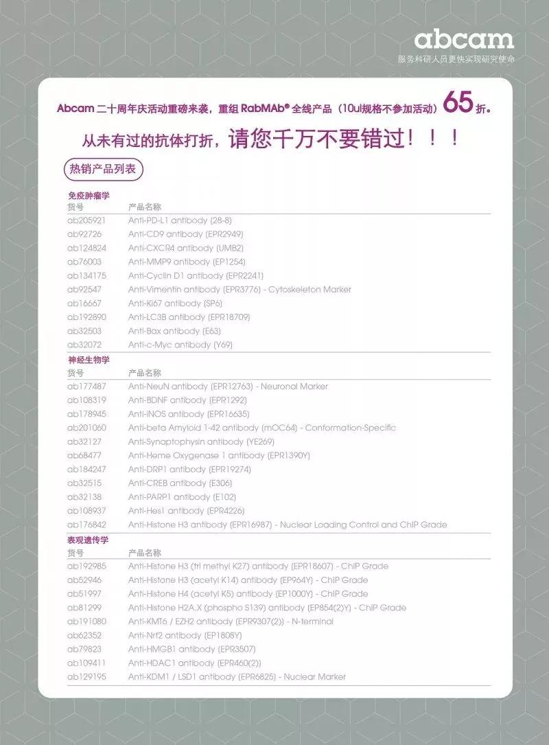 The second wave of Abcam's 20th Anniversary is in full swing. In order to give back to the new and old users who have long supported Abcam, the RabMAb? (abcam patented rabbit monoclonal antibody) will be reorganized as low as 65% (except for 10ul in small packages)! The decline has never been seen before! Help accelerate your scientific discovery!