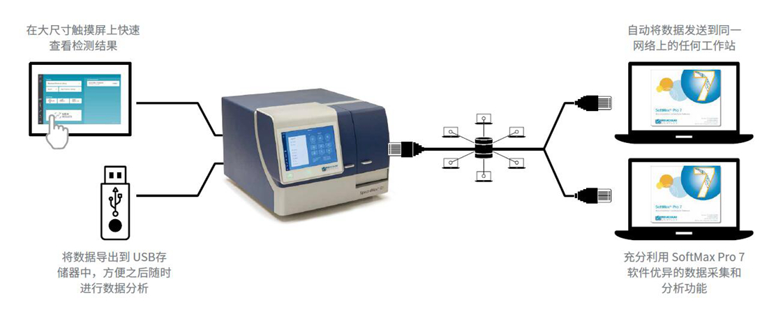 大大縮短收集數據的時間,提高您的工作效率。SpectraMax iD5 讀板機讓您隨心所欲地進行數據交互。可通過大尺寸觸摸屏快速查看您的數據,也可將數據導出到 USB 存儲器中,以便您在方便時對程序中的數據進行分析,您也可使用業界認可的數據采集和分析工具 SoftMax Pro 7 軟件進行數據分析。SpectraMax iD5 還可利用互聯網,讓您擺脫儀器的束縛,專注于您所關心的研究,數據會自動上傳至任何一臺在相同網絡中的工作站,無需像從前一樣,只能從單臺儀器上進行數據查詢。