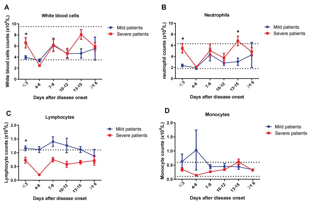 1. 重癥患者入院時外周血淋巴細胞的絕對計數顯著低于輕癥患者,而白細胞和中性粒細胞的絕對計數明顯高于入院時的輕癥患者(下圖)。
