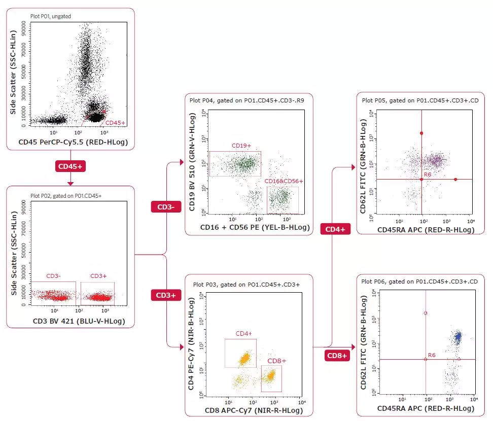 • CD4+和CD8+的T細胞分別用CD45RA和CD62L區別原始和記憶細胞。