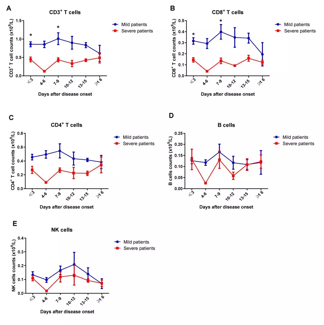 2. 與輕癥患者相比,重癥患者CD3+ T細胞、CD4+和CD8+T細胞亞群計數持續下降,而B細胞和NK細胞計數無顯著性差異(下圖)。