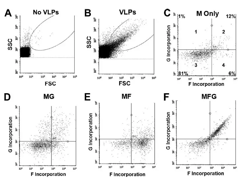 作者利用Guava 8HT檢測發現,相較于下圖A中PBS緩沖液,圖B中VLPS病毒FSC/SSC信號可以很好的與背景分開。圖C-F顯示分別連接了1種、2種和3種不同病毒糖蛋白片段后VLPs在四象限門內的表達變化。
