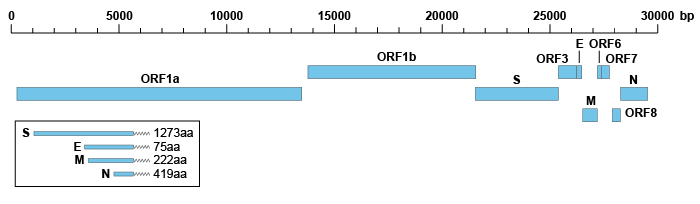 SARS-CoV-2 是一種約 30kb 的陽(yáng)性單鏈 RNA 病毒,其基因組組成與 SARS-CoV 相似,兩者都是由兩個(gè)主要的開(kāi)放閱讀框(ORF)和幾個(gè)較小的下游 ORF 組成。