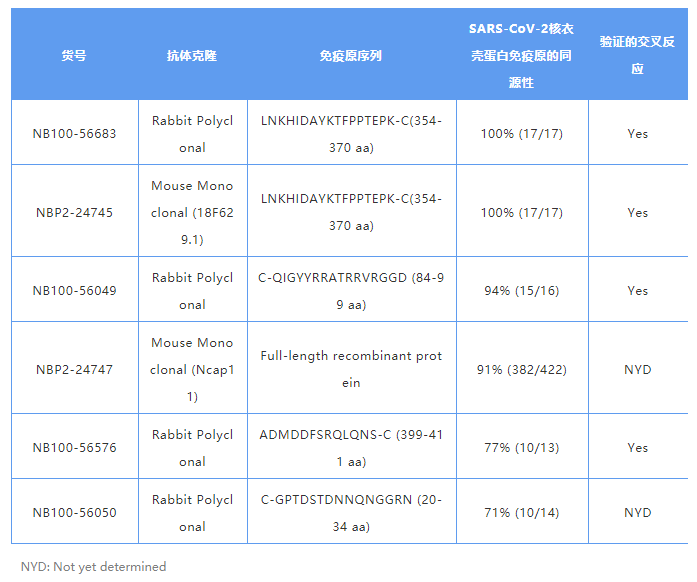 SARS-CoV-2 與 SARS-CoV 的核衣殼蛋白具有 91% 的序列同源性。Novus Biologicals? 提供了幾種用于檢測(cè) SARS-CoV 核衣殼蛋白的抗體,這些抗體可用于 WB、ICC / IF、ELISA 等多種應(yīng)用。