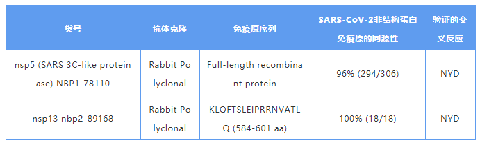 SARS-CoV-2 與 SARS-CoV 的 nsp5 具有 96% 序列同源性,nsp13 具有 99% 的序列同一性。Novus Biologicals? 提供了針對(duì) nsp5(NBP1-78110)和 nsp13(nbp2-89168)蛋白的兔多克隆抗體,這些抗體可用于 WB、ICC / IF、ELISA 等多種應(yīng)用。