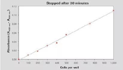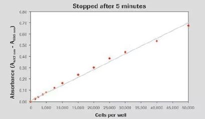 圖1. Cytotoxicity Detection KitPLUS (LDH)具有良好的線性;圖為使用該試劑盒測定不同數(shù)目U-937細(xì)胞培養(yǎng)基中總LDH活性,底物孵育5min后進(jìn)行檢測。