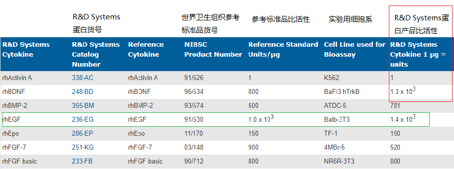 比如人 EGF 蛋白產品(貨號 236-EG),1 μg=1.4*103 U,如果文獻中所用的濃度為 100 U/mL,換算到該產品的質量濃度就是 100/1400=0.07 μg/mL。