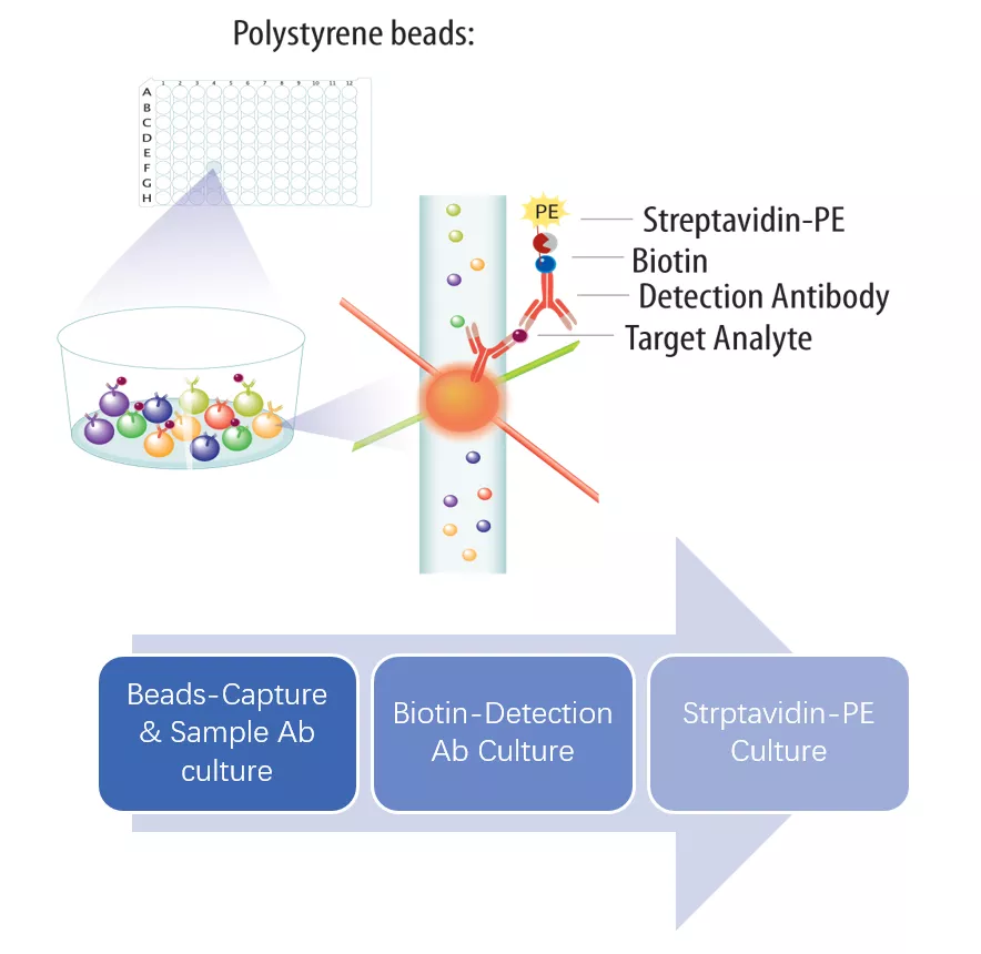 R&D Systems? 擁有 Luminex Assay 以及 Luminex High Performance Assay 兩個產品系列,均基于帶有顏色編碼的微球,這些微球表面包被了識別不同目標分析物的特異性抗體。當預包被的微球與待檢樣本孵育時,分析物被微球捕獲,經由生物素標記的特異性檢測抗體混合物識別,加入鏈霉親和素 - PE 熒光素底物后發光并進行定量檢測。