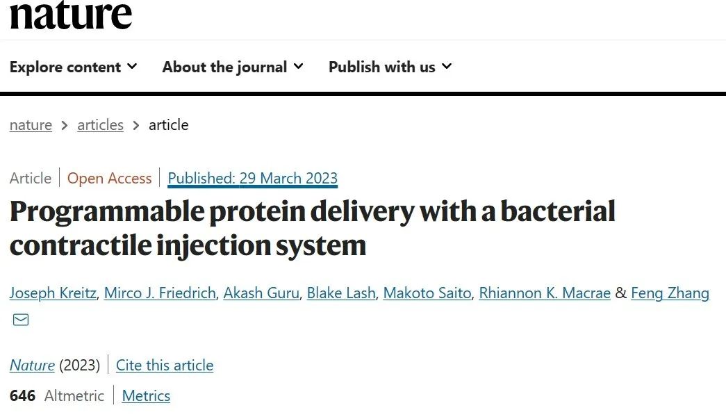2023年3月底,CRISPR的先驅者,華人科學家張鋒教授及其團隊在 Nature 期刊發表了題為:Programmable protein delivery with a bacterial contractile injection system 的研究論文。