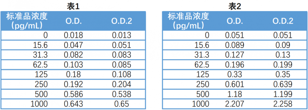 結果顯示,最高濃度(1,000 pg/mL)的標準品平均 OD 值僅為 0.647,且 125pg/mL 標準品兩個復孔 OD 值相差較大,低濃度標準品 OD 值無明顯梯度。因而無法保證檢測結果的準確性。而在使用了搖床的實驗中,標準品 OD 值正常(表 2)。