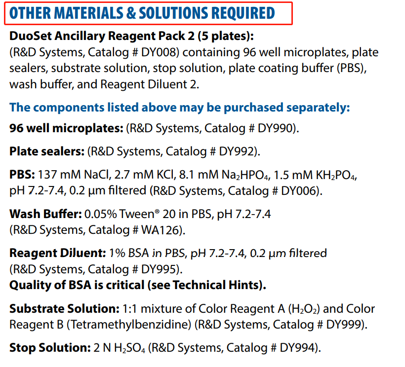 在說明書的「Other Materials & Solutions Required」部分,會提示需要搭配哪些試劑,產品頁面也會給出建議搭配的附屬試劑(請參考下圖)。大部分 DuoSet? ELISA 試劑盒可以直接購買成套的輔助試劑盒,例如 DY007、DY008、DY009 等。