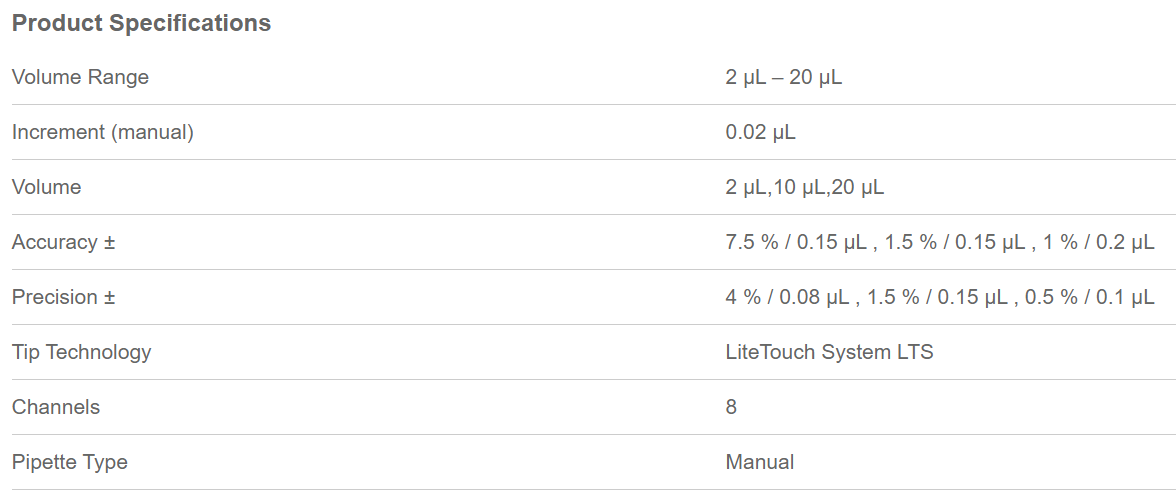 Pipet-Lite? XLS+ manual 8-channel pipette, 2-20 μL, uses LTS? LiteTouch? tips. Consistent sample pickup. Accurate,precise, ergonomic, volume lock, rugged, durable (L8-20XLS+)